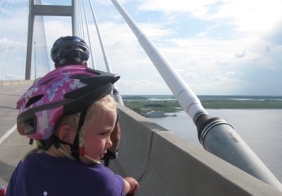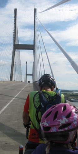You would think that we are flying down the bridge. But we are not. We are so high up, we would be going way to fast with no possibility of stopping. Bill keeps his hands on the breaks and we make it safely to the base of the bridge.