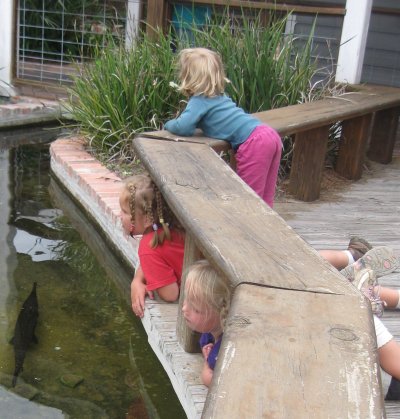 After lunch time we get to the town of Darien. We find a place to lunch on the river. A little pond is next to the entry way. In it are turtles and a couple of fish. The girls are loving it. Cheyenne discovers that the fish come to her as she splashes the water.