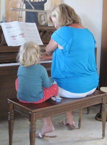 After we have refreshed ourselves in the swimming pool (and have eaten all the chocolate cookies...), it is time for some music. Cheyenne is testing the guitar, Robin is playing the harmonica and Jasmine is plinging the piano.
