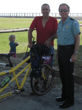 With slushy strenght, we continue south. It is not long when we see Wally and friend Bob. Wally is riding a recumbent-sort-of bicycle with a set of Z-torques. That is a newly developed set of cranks.