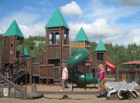 Just south of Eagle River we cross the road and enter the town. A potty break is necessary, thus we head further into town. The golden arches are already visible. Yes, there is a playground. Thus that's where we stop. It's a much longer break then we realize. But the girls are having a great time and we're meeting nice people.