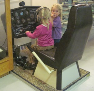Jasmine flies an airplane. Lots of buttons to press and levers to pull.