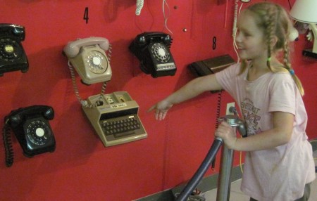Cheyenne admires the old telephones.