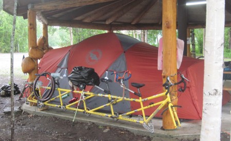 We're not quite sure what our destination is going to be for today. Somewhere up the road. Trapper Creek perhaps. We just keep on pedaling. Trying to leave the rain behind us. It doesn't rain anymore, but we do get wet from the mist. What a day. We're glad when we see a filling station up ahead, which turns out to be at Trapper Creek. Next door is a campground where they allow us to set up camp under the pavillion, next to the wood stove.