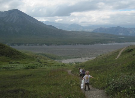 We're taking advantage of the shuttle buses. A car seat is provided for Robin. We can pick one up either at the Visitor Center or at the Wilderness Access Center. The bus drivers are very friendly and share a lot of information about the area. Whenever we see a wild animal we yell "STOP". If it's safe to stop the bus driver will stop and we can observe the moose, caribou or occasionally a bear, for a while. It's a great system. The free shuttle bus takes you all the way to Savage River, 15 miles up the park road. There you can enjoy the gravel bars, the 2-mile trail or a hike up to Savage Rock. Mount McKinly is visible from Savage Rock; weather provided.