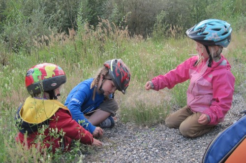 The path is great. The Glenn Highway is on our right. Traffic is whizzing by. The path is nicely separated and meanders between the the highway and the moose fence. We're rolling over the little hills. Just several miles further we're taking a break in the tall grass. It's already lunch time.