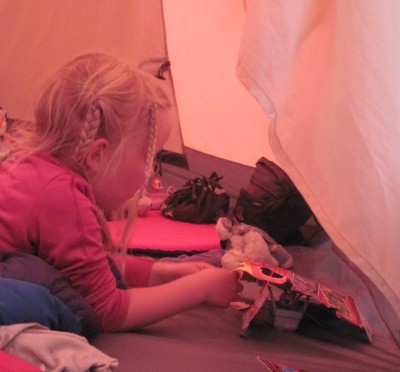 Amarins and the girls are staying at the campground. Amarins keeps the fire going. The girls do some coloring.