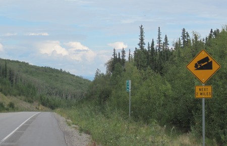 The Wasilla/Palmer junction is coming up. And what's on the sign? Our final destination! Fairbanks. This is the first time we've seen Fairbanks on the sign. It gives a strange feeling to be this close to our destination. Wow, we're making it. Almost a year ago we left Mount Vernon, Kentucky. Almost a year to get here...