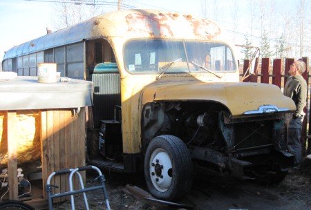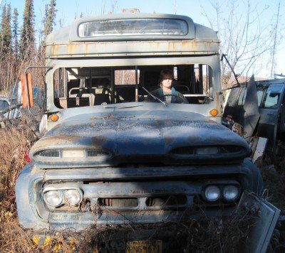 Finally on the Steese, Bill decides to take us by one more bus he wants us to see. Perhaps the owner is home today. We find the bus inbetween a bunch of other old junk vehicles. Between the trees, off in the shrubs. The owner isn't home, but a neighbor knows his number and thinks the bus might be for sale. We decide to check out the bus.