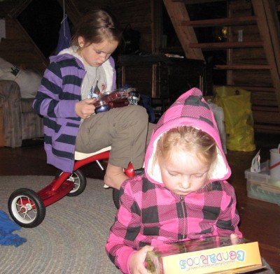 It's snowing! It's snowing. It's really snowing! The girls are full excitement, barely able to frinish their breakfast. There's maybe half an inch of snow on the ground, but that should be enough for sledding.