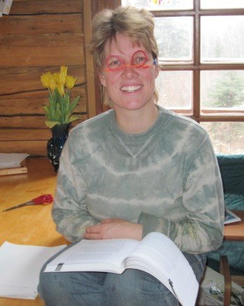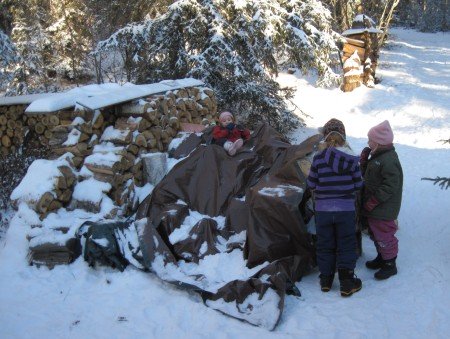 After Robin's pretend nap, we're ready to go outside. Early in the morning the sun is hidden by coniferous trees on the east. It's in the middle of the afternoon when the sun shines straight over the cabin onto the drive way. The best time of day to be outside, since there is sun everywhere. The clothes are dry and warm from hanging near the wood stove. We get dressed warmly, although it isn't really cold lately. The upper 20s perhaps. And of course we're getting used to the temperatures too.