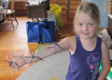 Today goes well with my toe. I can get around well. Still I can tell I shouldn't overdo it. The girls walk cautiously around me, full of concern still. They've tied ribbons to my leg, so they can easily see which one is the hurt foot. Robin asks regularly if my toe is feeling better yet. She can even copy my wobbly walk. So cute.
