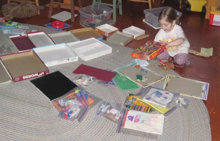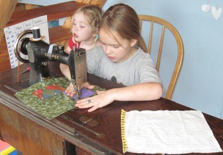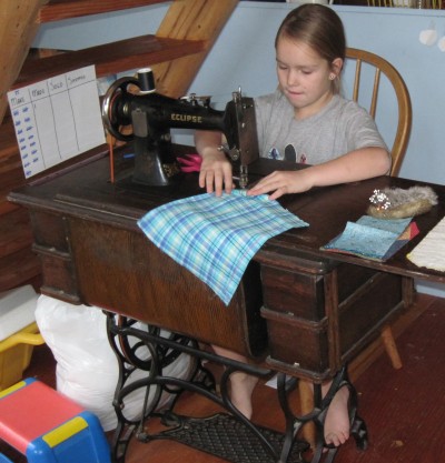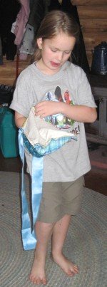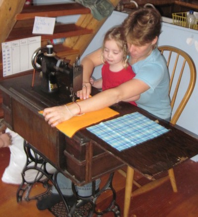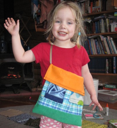 The sewing machine is still ready to go. It catches Robin's eye. She's going to make a purse now. She looks in the big yellow bag, pulls out the front and back, decides on which one is front and which one is back, and heads for the pocket box. She's so efficient. I pin the seems, then Robin hops in my lap. "Giddy up horsy." And off we are. With this strategy the pockets are on in no time. Now a ribbon to go with it and we can sew them all together. Within an hours time another purse is ready!