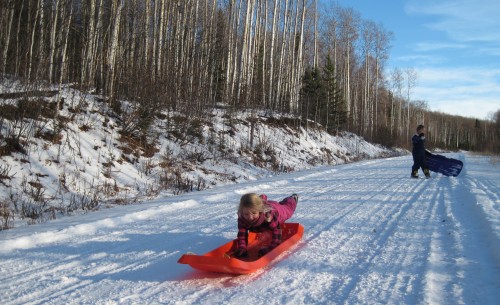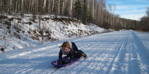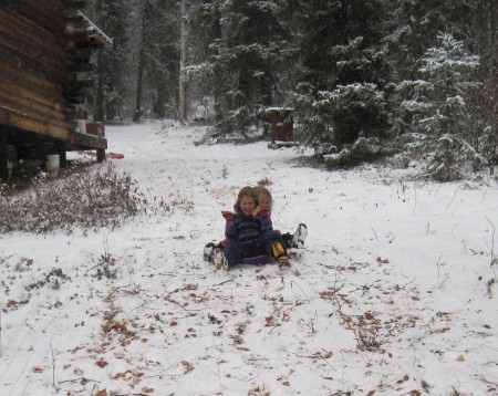 With the glasses we slide back down the hill. At least that's what we think. Arriving at the cabin, the glasses are no longer in my pocket. Thus we walk up the hill again. Of course to the delight of the girls. I find the glasses at the top of the driveway. Cheyenne and Jasmine have walked up with me, sleds in tow. So down we go again. It's exhilarating. I'm totally loving it. And I'm not the only one.