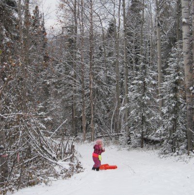 With a half eaten breakfast behind them, they jump into their snow pants, put on their jackets, mittens, hats and scarves and head out the door. Cheyenne brings up the dish and the big orange sled. Jasmine pulls up the purple one. Robin waits for me to walk up with them, but with the snow, I don't need to pull them back down. Gravity will do its part here.