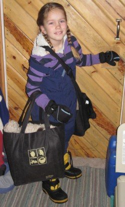 Bill walks with Robin down the hill. Cheyenne goes ahead in the purple sled. I'm in the back of the orange sled, with a big box of material in front of me. In front of the box is a water jug. Jasmine sits right on top. Slowly I guide the sled down the drive way. "Guide" might not be the most appropriate word, but let's just say I'm keeping it between the trees. Jasmine is having a blast. And so do I!