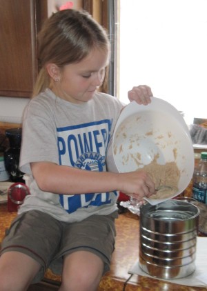 The afternoon is for breadmaking. I can walk around well enough and stand long enough to piddle in the kitchen. And the first thing I'm going to do is make some bread. We're flat out. It's a long project, with long waiting times for the rising of the dough, but the result is always ooh-la-la. The girls almost fight over the opportunity to help. Funny.